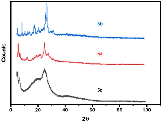 Figure 3 displays the XRD pattern of the 5a–c polymers; as observed from Figure 3, the spectra of 5c polymer does not exhibit any sharply peak due to its amorphous nature, which further supports its low compactness. While the two polymers 5a and 5c showed a mostly amorphous phase with few crystalline materials. In addition, the 5b polymer have more than five strong fairly sharp diffraction peaks appeared at 2θ = 5–30°, giving a pattern typical of crystalline materials.