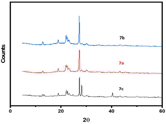 Figure 4 displays XRD pattern of the 7a–c polymers, as observed from Figure 4 the polymers showed sharp peaks in the intensity versus scattering angle (2θ) plot. More than six strong fairly sharp diffraction peaks appeared at 2θ = 5–40° for 7c, 7b and 7a, giving a pattern typical of crystalline materials. Based on the XRD spectrum, it was found that the crystallization of 7a–c was higher than that of 5a–c. This might be attributed to the presence of oxygenated functional groups in 7a–c, which make the polymer chains more aligned by hydrogen bonding.