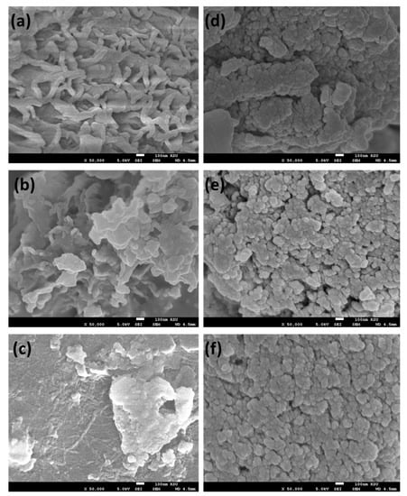 SEM images of samples (a) 5a, (b) 5b, (c) 5c, (d) 7a, (e) 7b, and (f) 7c.