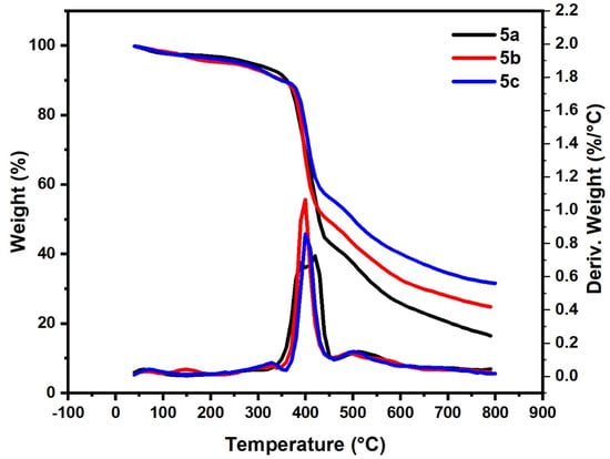 TGA was used to investigated the thermal degradation performances of the prepared polymers 5a–c. Degradation curves were obtained for the prepared compounds of the 5a–c (Figure 6 and summarized in Table 3). As observed from Figure 6 and Table 3, the first degradation peaks in the range 50–100 °C for compounds 5a–c, with mass loss about 2–3%, are related to the loss of the solvent content. Compounds 5a–c showed one main degradation peak in the range 320–460 °C, 340–450 °C and 350–450 °C with mass loss 57.88%, 50.50% and 43.70%, respectively. At 800 °C, the residual weight of 5a, 5b and 5c was 16.52, 25 and 31.55%, respectively. This result indicates that the nature of the substituent group in the Para site plays an important role in the thermal behavior of the prepared polymer. Where the electron-releasing group, as OCH3 in 5c and weak electron-attracting group as Br in 5b, is relatively more thermally stable than the unsubstituted one 5a.