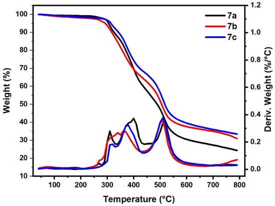 Table 4 summarizes the thermal properties of the other series (bishydrazido derivatives) 7a–c (Figure 7). As shown in Figure 7 and Table 4 the thermal degradation process of polymers 7a and 7c were classified into main three steps; their initial decomposition was between 280–235 °C and 250–330 °C, with mass loss of 10% and 6%, respectively. The second degradation step started in a range of 335 °C to 440 °C and 330 to 430 °C with mass loss of 29% and 23%, for 7a and 7c, respectively. The main third degradation step started in the range of 470 °C to 630 °C and 440 to 650 °C with mass loss of 24% and 31%, for 7a and 7c, respectively. On the other hand, it was observed that the thermal behavior of the 7b sample differs from that of samples 7a and 7c as it occurred in two main steps. The main first and second degradation steps started in a range of 250 °C to 430 °C and 430 °C to 620 °C with mass loss of 38% and 34%, respectively. This result revealed that polymers-based s-triazine 7a and 7b have highly thermal stability compared to their analogs bihydrazino derivatives 5a,b, while 5c showed higher thermal stability compared to 7c. The substituent functional groups on the phenyl ring also affected the thermal stability of the prepared polymers. The electron-releasing groups, as OCH3 in 7c and weak electron-attracting group as Br in 7b, are relatively more thermally stable than the unsubstituted one 7a. These data agreed with our previously reported data [43].