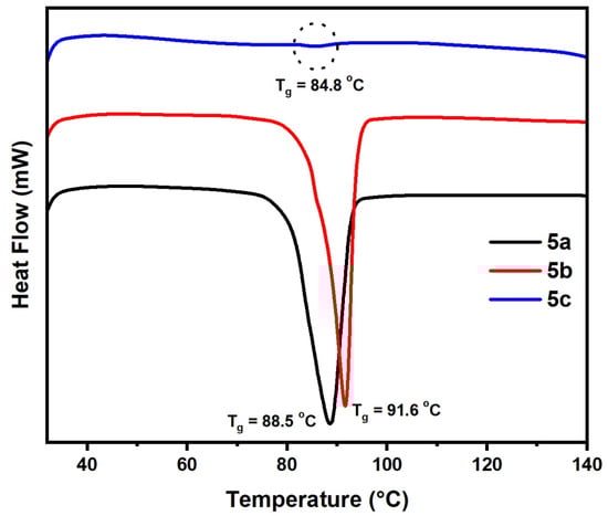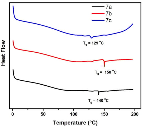 The thermal properties of 7a–c polymers with different substituent were evaluated and summarized in Table 4, Figure 9 and Figure S5. The Tg of the polymers were tested by DSC. The Tg values of 7a–c polymers were in the range of 129–150 °C, which were found that Tg values of the polymers are slightly similar to each. There are no other obvious exothermic or endothermic peaks in the DSC scans were observed for 5a–c and 7a–c polymers, indicating the high purity sideways with a good stability of polymers.