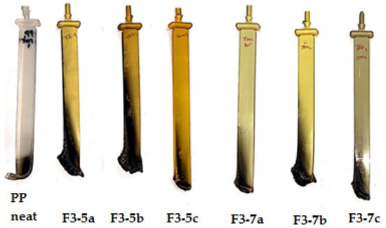 Moreover, F3-5c sample reached the UL-94 V-0 rating without dripping, while the other samples showed UL94 V-1 rating. This indicated that F3-5c composite has high efficiency in enhancing the flame retardancy behavior of PP amongst all PP-composites. These results established that the mixing of 5a–c with APP in ratio (1:2) improve the flame-retardant behavior of PP. Figure 10 indicated the photographs of F3-5a, F3-5b and F3-5c specimens after UL-94 tests. As indicated in Figure 10, F3-5a, F3-5b, and F3-5c specimens showed char residues, while neat PP showed a melted form without clear char residues.