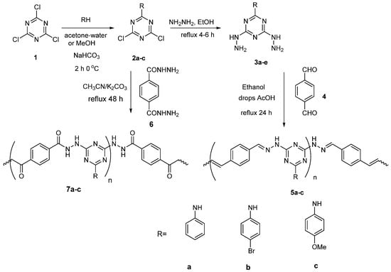 First, terephthalic acid hydrazide 6 was prepared according to the reported method [45] and then used for preparation of the desired polymers. Terephthalic acid hydrazide 6 (20 mmol) in 100 mL acetonitrile were added slowly to a solution of 2,4-dichloro-6-substituted s-triazine derivatives 2a–c (20 mmol) in 100 mL acetonitrile in a period of 15 min followed by addition of K2CO3 (45 mmol) at 25 °C. The reaction mixture was refluxed for 48 h, then solvent was removed under vacuum, and more water was added. The precipitated product was filtered, washed with water, ethanol, and then dried for 8 h at 60 °C to afford the desired polymers 7a–c in yield 80–85%.