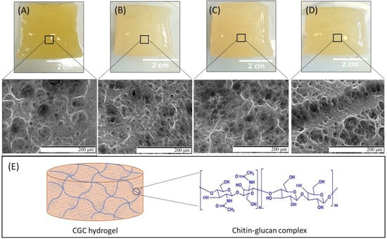 Macroscopic aspect and SEM images of Na51 (A), Na52 (B), Na53 (C), and Na51* (D) hydrogels under magnification 500×; chemical structure of CGC and schematic representation of the CGC hydrogel (E).
