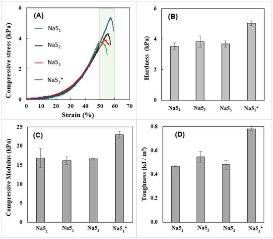 The compressive modulus and toughness of the CGC hydrogels, obtained from the stress–strain curves, are represented in Figure 3C,D, respectively. As shown in Figure 3C, similar compressive moduli were displayed by the Na51, Na52, and Na53 hydrogels (16.8 ± 2.6, 16.2 ± 1.0, and 16.6 ± 0.3 kPa, respectively), demonstrating that the number of freezing cycles had no significant impact on their stiffness. Nonetheless, the Na51* hydrogels were the stiffest material, characterized by a considerably higher compressive modulus (23.0 ± 0.89 kPa). As expected, analogous behavior was obtained for the hydrogels’ toughness values. Figure 3D shows that the Na51* hydrogels exhibited the highest toughness value (0.78 ± 0.015 kPa), while the remaining hydrogel samples displayed values between 0.47 ± 0.003 and 0.55 ± 0.045 kPa. Despite the similar polymer content, the wispy porous structure of the Na51* hydrogels might have resulted in higher strength, thus improving their compressive modulus.