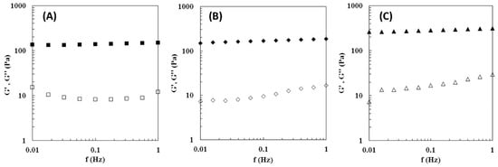 Rheological properties of the Na51* hydrogel (A), Na51* rehydrated hydrogel (B) and Na51* loaded hydrogel (C), at 25 °C. Mechanical spectrum storage (G′, solid symbols) and loss moduli (G″, open symbols).