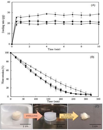 The water retention kinetics of the Na51* hydrogels are shown in Figure 5B. It can be observed that, after placing at 37 °C for 320 min, over 95% of their water content was evaporated and the hydrogels considerably reduced their volume (Figure 5C).