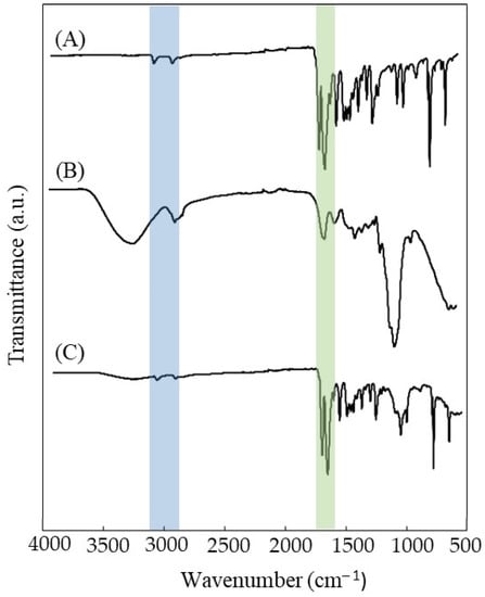 FTIR spectra of (A) caffeine, (B) Na51* hydrogels, and (C) Na51* loaded hydrogels.