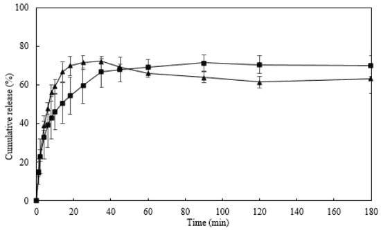 where Cw (g/L) is the caffeine concentration in the withdraw solution, V (L) is the volume of the release media, and DL (g) is the amount of loaded drug. The caffeine cumulative release was fitted to the Korsmeyer–Peppas model [26].