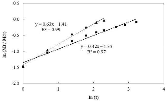 where Mt and M∞ represent the amount of caffeine (g) released at time t and infinite time, respectively; k is the kinetic constant characteristic of the drug-polymer interaction and n is an empirical parameter for the release mechanism. According to this model, the diffusion mechanism can be classified as controlled diffusion (Fickian diffusion), anomalous transport (non-Fickian diffusion) and controlled swelling, as a function of the relationship between the diffusion rate and the polymer relaxation process [26,55]. For cylinder samples, a value of n ≤ 0.45 indicates a Fickian diffusion, 0.45 ≤ n ≤ 0.85 is a non-Fickian diffusion and n ≥ 0.85 represents a relaxation-controlled diffusion. Plotting ln (Mt/M∞) vs. ln (t), the kinetic parameters n and k can be calculated from the slope and the interception, respectively.
