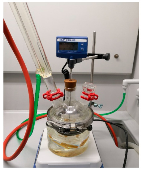 Fir wood (Abies alba Mill.) was chemically modified with styrene monomer. RAFT modification was performed on a wooden sample to graft poly (styrene) (PS) onto the wood. Part of the procedure was taken from Cabane et al. [20]. Grafting was carried out using styrene monomer and modified azo initiator 4,4′-azobis (4-cyanopentanoyl chloride (ACPC)). The modified azo initiator 4,4′-azobis(4-cyanopentanoyl chloride) (ACPC) was selected as a polymerisation initiator due to its easy non-catalysed coupling to various surfaces and low decomposition temperature. ACPC was synthesised according to the following procedure: thionyl chloride was slowly added to a cooled solution of 4,4′-azobis (4-cyanopentanoic acid) and triethylamine in dichloromethane (DCM) under nitrogen atmosphere. After 30 min, the ice bath was removed, and the reaction was continued for 12 h at room temperature. After filtration of the precipitate, DCM and traces of unreacted thionyl chloride were removed by rotary evaporation at room temperature. The solid obtained was dissolved in 180 mL of chloroform, then precipitated in 180 mL of hexane, and dried under a high vacuum for 1.5 h at room temperature. After creating the initiator, wood samples were placed under vacuum for 30 min (550 mbar) to extract air. After 30 min, the initiation mixture consisting of 3.02% of initiator (ACPC) and 8.78% triethylamine mixed in 100 mL of dimethylformamide was prepared. The solution was then added to the reactor and stirred with the wood samples for 10 h. After completion of the initiation reaction, wood samples were blotted and washed with acetone to remove unreacted ACPC. For polymerisation, 100 mL of styrene was poured into the reactor, heated to 75 °C and stirred for 2 h (Figure 1).