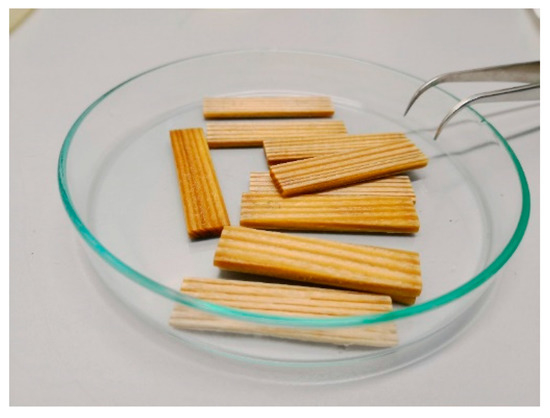 Fir wood (Abies alba Mill.) was used for the study. The wood samples with nominal dimensions of 45 mm × 10 mm× 2 mm (l × w × t) were prepared from the fir wood boards cut into lamellae. The length of the test samples corresponded with the longitudinal axis of wood. All wood samples were oven-dried at 103 °C to constant weight and stored in a desiccator over silica gel before treatment. The final average mass of test samples was 0.45 g, with an average moisture content of 7.63%. The moisture content was obtained by the gravimetric method according to ISO 13061-1:2014 [22].