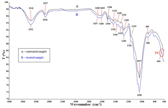 The amorphous and crystallised cellulose have been characterised using the assigned peak for cellulose at 1422 cm−1 and 1364 cm−1 for CH2 and methoxyl C-H bendings of lignin, respectively, the band at 1315 cm−1 (CH2 wagging) was used as specified for the crystalline cellulose, 1153 cm−1 and 892–896 cm−1 for C-O-C stretching and C-H deformation, respectively [23,24]. The most intense peak around 1027 cm−1 is related to the C-O stretching of cellulose and hemicellulose. After modification with styrene, a new absorption peak appeared at 696 cm−1 due to the phenyl group of styrene. Generally, the polymer will form a chemical bond with the surface or be attached physically. Therefore, the presence of characteristic peaks of styrene indicated the presence of the PS in the cell wall.