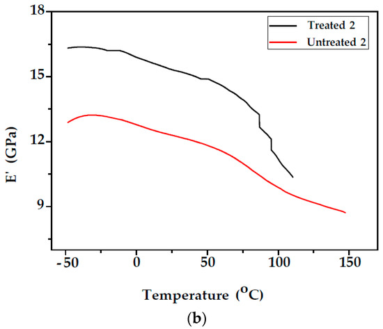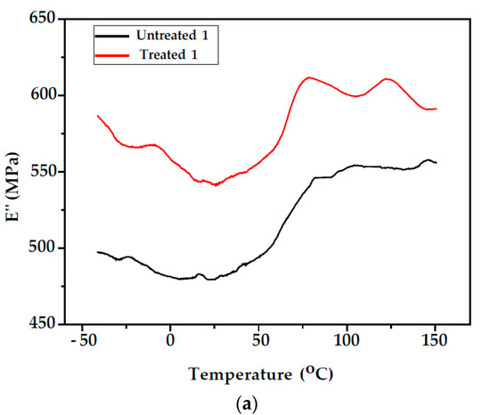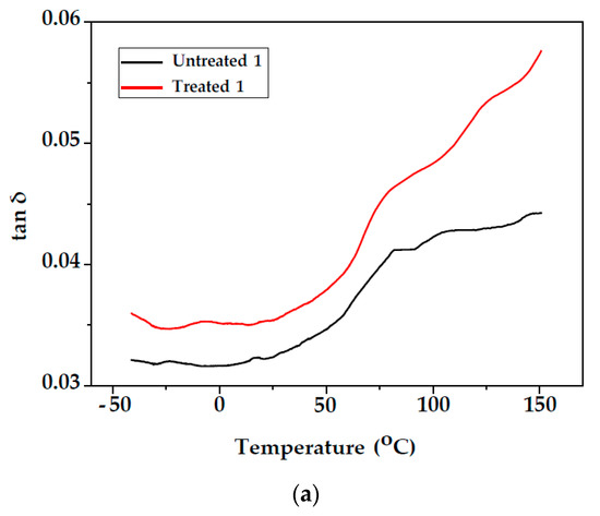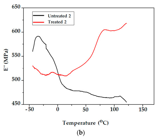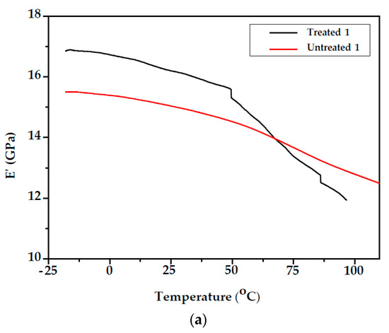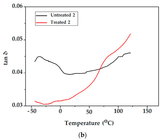 The variation in the storage modulus E′ of unmodified and modified fir wood samples (Samples 1 and 2) as a function of temperature can be observed in Figure 6. From the E′ vs. T curves, it can be observed that the storage modulus for unmodified and modified fir wood of Samples 1 and 2 decreased with increasing temperature. This behaviour can be attributed to the increase in the chain mobility of the polymeric components of the wood cell walls at higher temperatures [29]. As a result, the drop in the modulus on passing through the Tg is higher for the modified samples compared with the unmodified. After styrene treatment, storage modulus E′ increased compared with the unmodified wood in both samples, which may be due to the increase in the stiffness (Table 1). Since the DMA instrument cannot control and regulate humidity, testing requires that the wood is in two possible states: either completely plasticised or oven-dry [30].