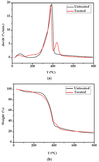 Figure 7 illustrates the thermogravimetric (TG/DTG) curves of unmodified fir wood under a nitrogen environment. Three-weight loos steps were observed. The first step of degradation occurred between 25 °C to 150 °C with Tmax at 72.2 °C was attributed to moisture loss and absorbed water. Weight loss during this period was 5.2%. The initial decomposition temperature at 289.3 °C shows the starting point of wood decomposition. Typically, wood has a larger shoulder region due to the degradation of hemicelluloses before the degradation of cellulose. According to the DTG thermogram of unmodified fir wood, two peaks observed in the interval temperature from 180 to 425 °C correspond to the decomposition of hemicellulose and cellulose. Hemicellulose decomposition was observed from 180 to 340 °C as a less pronounced shoulder at 322 °C and cellulose decomposition from 340 to 425 °C with a maximum peak at 379.9 °C. Cellulose is highly crystalline, whereas hemicellulose is amorphous and degrades before cellulose. According to Chow and Pickeles, this weight loss involves decomposing cellulose crystals and hemicellulose into levoglucosan [31]. Lignin was the most difficult one to decompose because its decomposition is slow and occurs from 200 to 900 °C [32]. Therefore, a shoulder is observed at about 420 °C with a peak at 458 °C. This high-temperature shoulder can be assigned to the end of an overlapping degradation process of lignin. According to the DTG thermogram of the modified fir wood, the weight loss occurs at three distinct steps. The first step at 70.1 °C (Tmax1) with 2.783% weight loss was a dehydration process, in which free water in the wood sample evaporated. The mass loss of modified fir wood samples was lower than untreated samples from 25 to 150 °C, indicating that the moisture content of modified fir wood was lower than that of the untreated wood. The second step was at 377.0 °C (Tmax2) with 54.37% weight loss mainly caused by the thermal decomposition of cellulose [31].