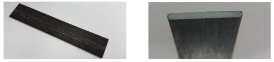 In the pultrusion process, fibres were rolled out from the roving into the production line through a guided plate. The number of rovings for the selected batch was between 69 and 72. Each roving consisted of 6000 fibres. Due to the application of different sizing strategies, i.e., sized once vs. sized twice, the effective fibre diameter changed. The fibres then went through the resin impregnation bath at a speed of 6 mm/s. The impregnated fibres further passed through a preformer (cross-section 32 mm × 3 mm in Figure 1) to the curing chamber. The 1 m-long chamber was divided into three equal compartments operating at temperatures of 120 °C, 130 °C and 165 °C, respectively. The pulling force, which was transmitted to the BFRP-profile by a caterpillar pulling machine, was equal 2.2 kN.
