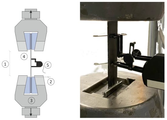 Schematic of tensile test: 1 = free length, 2 = projection of jaws, 3 = jaws, 4 = glued end tabs made from unidirectional glass-epoxy laminate, 5 = extensometer.