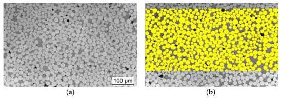 The fibre content has an impact not only on the cross-linking process of the resin system [33] but also, as a result, on mechanical properties, such as the elastic modulus and the tensile strength. Fiore et al. [34] summarised the influence of different fibre contents in BF composites on the various properties. As has been noted by Amuthakkannan et al. [35], the higher the BF content is, the higher is the tensile strength. Therefore, to quantify the fibre volume content of the BFRP lamella, corresponding samples are extracted from the lamella and embedded in a resin. The specimens have then been polished, and the fibre volume content was calculated using greyscale analysis based on light microscopy images (see Figure 3). Fibre volume fraction and porosity of the developed BFL are shown in Table 2.
