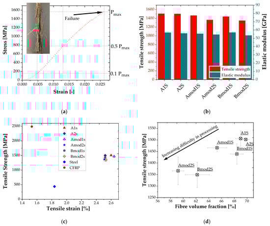 Figure 4b shows the variation of tensile strength and modulus of the developed basalt fibre lamella with respect to the applied sizing (1S and 2S, cf. Section 2.1) and matrix modification (mod). It is evident from the figure that the matrix modification led to a slight decrease in tensile strength. The elastic modulus shows almost no significant difference between the treatments. Composites with one-time sized fibre and no matrix modification show the highest tensile strength (1562 MPa) followed by the composite with double sizing and no matrix modification.