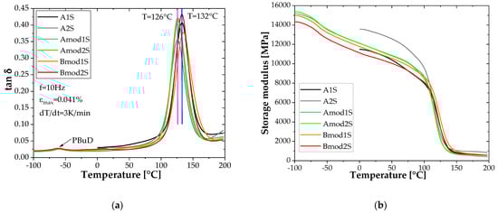 To investigate the influence of the modifiers and the applied fibre sizing on the thermomechanical properties of the cured BFRP lamellae, dynamic mechanical analyses were performed. Figure 6a shows the temperature dependent development of the mechanical damping coefficient tan δ of the various basalt fibre systems. All BFLs show a quite similar dynamic-mechanical behaviour, i.e., the damping increases slowly with increasing temperature up to the region of the dynamic glass transition, i.e., the transition from the solid to the viscoelastic state. This is also reflected in a sharp drop of the storage modulus (Figure 6b). The data show dynamic glass transition temperatures Tg in the range from 125.6 °C to about 135 °C, whereas the CR141 systems (B) show the highest values. The mechanical damping is strongly dependent on the present fibre volume content of the samples and varies in the range from 0.356 and 0.432. The basalt fibre has an approximately five times lower thermal conductivity (0.031–0.038 W/mK [40,41,42]) compared to the epoxy resin system (0.1 to 0.2 W/mK [43,44]), which can influence the heating process (heat flux) of the sample and thus the relaxation behaviour. The values are summarised in Table 3. There was no discernible postcuring of the systems, which would have been indicated by an increasing modulus after passing the region of the glass transition.