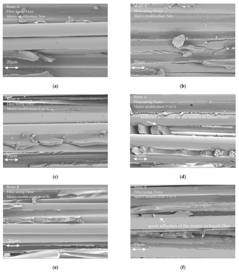 Figure 7 shows representative interlaminar fracture surfaces of the different basalt fibre reinforced lamella, obtained via scanning electron microscope (SEM) [45]. Qualitatively, there are only minor differences between the various fracture surfaces of the different material systems. However, the adhesion quality of the double-sized fibres seems visually better than the fibre–matrix interaction of the single-sized systems, especially Figure 7b,f show an enhanced fibre–matrix adhesion. The more sizing is present on the fibres the better the bonding quality to the matrix system. Even though, this enhanced interaction quality did not show a significant improvement of the tensile properties, as shown in Figure 4b, it is expected to yield a higher resistance to interlaminar crack propagation, i.e., enhanced fracture resistance of the lamella.