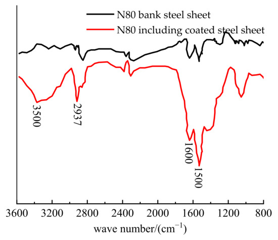 Figure 2 shows the infrared spectra of N80 steel plate coated with polydopamine. It can be seen that compared with the blank N80 steel plate, the polydopamine-coated steel plate had a broad peak between 3000–3500 cm−1. This was ascribed to the O-H (hydrogen bond) stretching vibration formed between the dopamine molecules or the stretching vibration of the aromatic secondary amine group. The broad peak between 1450–1625 cm−1 was the absorption peak of benzene ring skeleton vibration and N-H bending vibration [16,17]. The broad peaks appeared at 1500 cm−1 and 1600 cm−1 were ascribed to the benzene ring proton, -NH2, -NH- and -OH group stretching vibration. The absorption peak at 2937 cm−1 was a C-H stretching vibration peak, proving the successful construction of polydopamine coating on the surface of N80 steel.