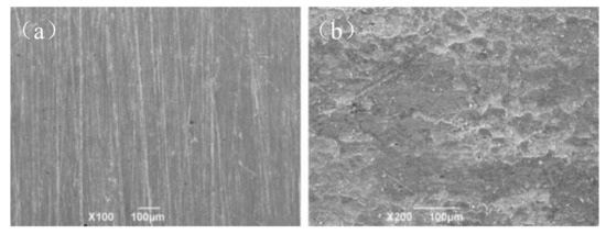 In order to further observe the microcorrosion morphology of N80 steel surface, a corrosion test was performed on N80 steel plates with/without polydopamine coating. The corrosive medium was 90 °C produced water of oil well. Scanning electron microscopy analysis was performed on each corroded steel plate, and the results are shown in Figure 4. It can be seen that the surface of the steel sheet with polydopamine coating after the corrosion test was significantly smoother than that of the blank sample. After corrosion, many pits appeared in the N80 steel plate without coating, indicating that the coating has a good corrosion inhibition effect on N80 steel plate. This may be due to the strong adsorption characteristics of the polydopamine cross-linked layer [18,19].