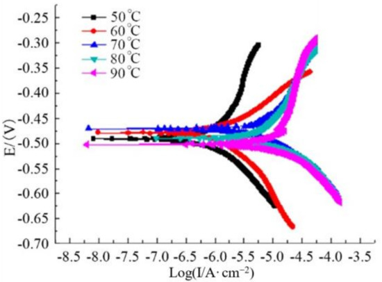 Figure 5 shows the polarization electrode curve of polydopamine-coated N80 steel plate in oil well produced water. It can be seen that at 50 °C, the anodic polarization curve was the steepest and the corresponding self-corrosion current density was the smallest. This indicates that the corrosion rate of the N80 steel plate was relatively small at this temperature. As the temperature further rose, although the cathode and anode polarization curves shifted to the lower current direction, the anodization curve became gentle and the anode self-corrosion current density increased. It means that the corrosion rate of the metal anode increased with the rising temperature, and the ability of the polydopamine coating to inhibit the anode reaction became worse [20]. Furthermore, the corrosion of anode (N80 steel) tended to aggravate. The results are consistent with those obtained by weight loss method.