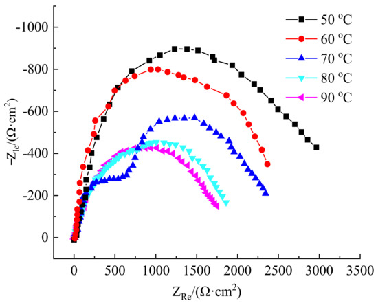 Figure 6 shows the polydopamine-coated impedance spectra of N80 steel plates in oil well produced water at different temperatures. It can be seen that capacitive reactance arcs representing charge transfer appeared in impedance spectra at high frequency. As the temperature rose, the capacitive reactance radius of the capacitive reactance arc decreased, indicating a decline in the surface resistance of the metal. It means that the higher the corrosion temperature, the more serious the corrosion of N80 steel plate by oil well produced water. With the increase of temperature, the anti-corrosion ability of polydopamine-coated N80 steel became worse, which is consistent with the results measured by static weight loss and polarization curve.
