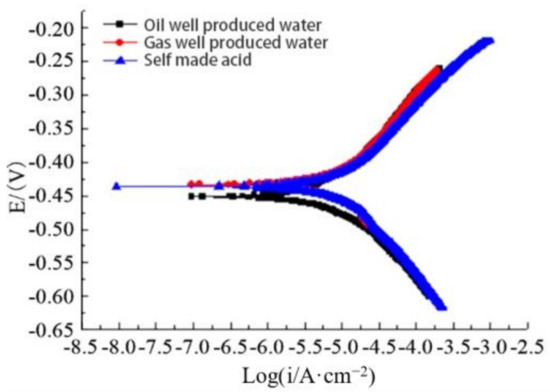 Figure 7 shows the polarization curve of polydopamine-coated N80 steel plate in oil well produced water, gas well produced water, and acid solution. It can be observed that the polarization curves of the electrode in the three solutions had no obvious difference. In addition, the variation trends of the cathode and anode polarization curves were close, so were the corresponding current density ranges. These indicate that the dopamine coating had similar corrosion inhibition ability in various corrosive media, which is consistent with the results by the static weight loss method.