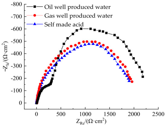 Figure 8 shows the impedance spectra of polydopamine-coated N80 steel plate in different corrosive media. As can be seen from Figure 8, the impedance spectra of the coated N80 steel plate in the three media of oil well produced water, gas well produced water, and acid solution were relatively close, so were the arc shapes and radii of capacitive reactance. These prove that the corrosion inhibition properties of polydopamine-coated N80 steel plate in the three corrosive media were similar, consistent with the results measured by the static weight loss and the polarization curve.