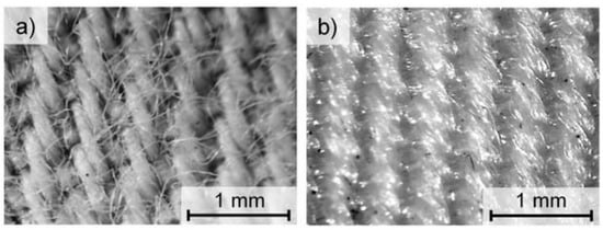 Two fabrics made of cotton and polyester (PES) were the subject of the research. The characteristics of both fabrics made by Trans-Tex (Rzgów, Poland) are shown in Table 1, while Figure 1 shows the optical microscopy image of the fabrics. Both tested fabrics had the same weave and the same order of magnitude in thickness, surface mass and yarn porosity. The choice of cotton and polyester as fabric raw materials was aimed at verifying the modification of textiles made of several types of fibers (natural and synthetic).