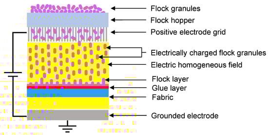 The flocking method uses an electrostatic field to accelerate and spatially orientate electrically charged flock (short textile fibers or powder) deposited on the adhesive substrate (scheme of the method was presented in Figure 2). The flocking method can be used to modify the surfaces of textiles, wood, paper, foil, plastic, metal, plaster, glass, cardboard, concrete, rubber, and others. The method is widely used in the automotive industry (carpets, upholstery elements, storage compartments, cockpits, gaskets, soundproofing, etc.), textile (prints, patterns, etc.), toys (artificial grass, hair, etc.), jewelry industry (cassettes, boxes, packages), collectors (e.g., inside drawers for coins), furniture, as well as in the production of various types of packaging, boxes, bottles, stampings (as a decorative element and at the same time protecting the object). Deposited flock layer as a material is antistatic, abrasion-resistant, sound-absorbing, resistant to washing and cleaning, and has thermal insulation and filtration properties [56,57,58,59,60].