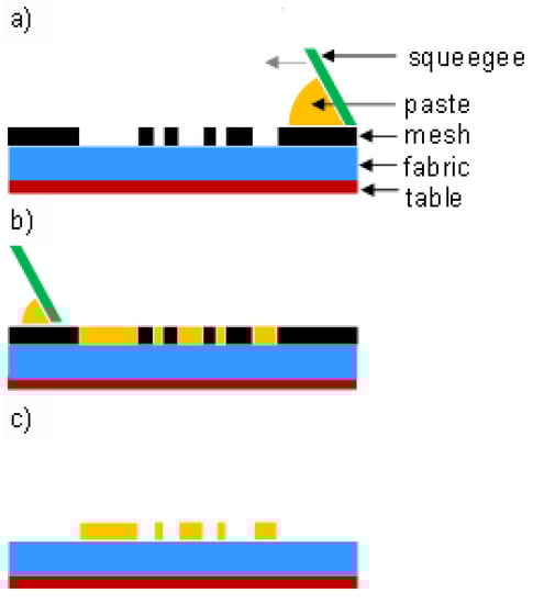 Scheme of screen printing. (a) applying paste on the mesh; (b) forcing the paste through the mesh; (c) screen printed fabric.
