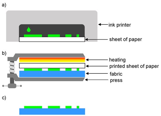 Scheme of thermal-transfer printing: (a) transferring the graphics to a paper substrate using the printer; (b) transferring graphic from paper to fabric using heat and press, (c) thermal transfer printed fabric.
