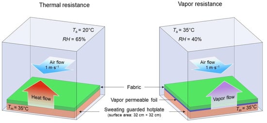 where: pm—saturated water vapor partial pressure [Pa] at the surface of the measuring plate at the temperature Tm; pa—partial pressure [Pa] of water vapor in the air in the measuring chamber at the temperature Ta; A—surface of the measuring plate [m2], H—heating power [W] supplied to the measuring plate; ∆He—heating power correction [W] in the case of measuring the water vapor resistance, Ret0—instrument constant [m2·Pa·W−1] for the measurement of water vapor resistance according to ISO 7243. The measurements were performed under the following constant conditions: thermal resistance: Ta = 20 °C, RH = 65%, air flow speed 1 m·s−1; water vapor resistance: Ta = 35 °C, RH = 40%, air flow speed 1 m·s−1 (Figure 6).