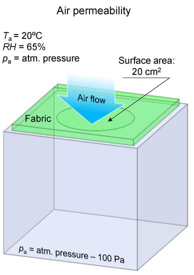 The measurements of air permeability of tested fabrics were performed using an air permeability tester (FX 3300 model made by Textest Instruments in Schwerzenbach, Switzerland) according to PN-EN ISO 9237:1998 in following constant conditions: relative humidity—RH = 65%, air temperature—Ta = 20 °C, and air pressure—pa = 1013.25 hPa (Figure 7).