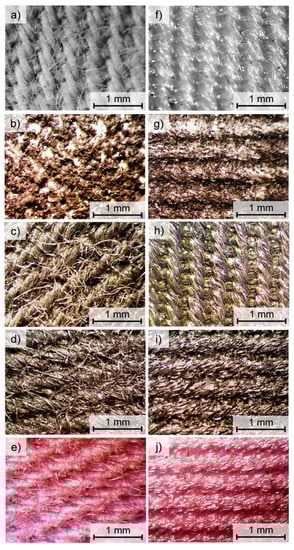 Optical microscopy images of cotton fabric ((a)—unmodified, (b)—flocked, (c)—layer by layer modified, (d)—screen printed, (e)—thermal transfer printed) and PES fabric ((f)—unmodified, (g)—flocked, (h)—layer by layer modified, (i)—screen printed, (j)—thermal transfer printed).