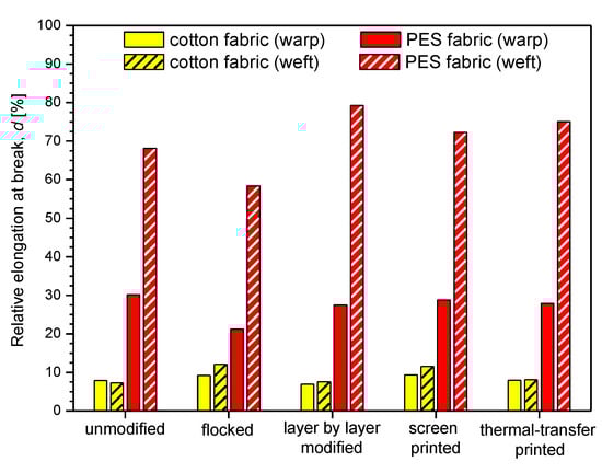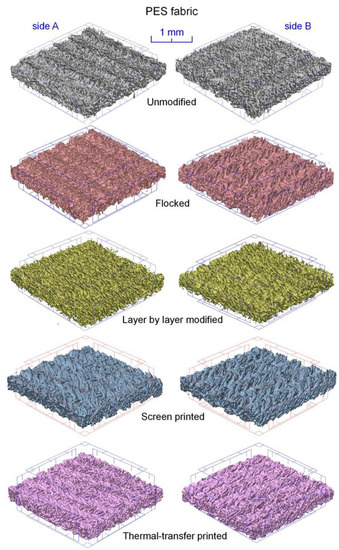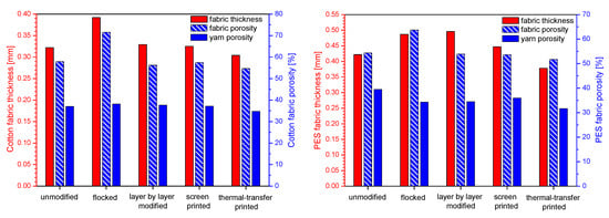 For the modified PES fabric, the following fabric thickness changes were observed compared to the unmodified one: flocked (+15%), layer-by-layer modified (+18%), screen-printed (+6%), thermal-transfer printed (−10%). In the case of yarn porosity, the following differences were observed: flocked (−13%), layer by layer modified (−13%), screen printed (−9%), thermal-transfer printed (−20%), while for the fabric porosity the following changes were observed: flocked (+17%), layer by layer modified (−1%), screen printed (−1%), thermal-transfer printed (−5%).