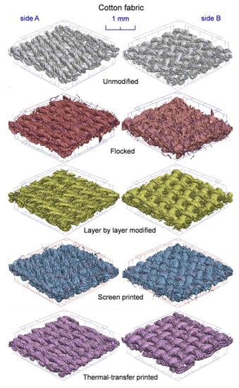 Computed microtomography 3D reconstruction of unmodified and modified textiles (cotton fabric—Figure 10, PES fabric—Figure 11) was obtained. In order to compare the effects of the applied modification methods, all the 3D reconstructions show fabrics with a surface area reduced to a square with sides 3 mm × 3 mm. The 3D reconstructions showed a modification effect on both sides of tested fabrics (side A—unmodified, side B—modified).