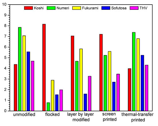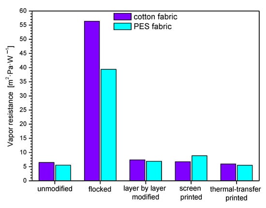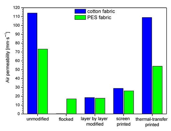 The research results presented in this article have shown that each of the surface modification methods used affects the biophysical and sensory comfort of the user of the final product. The best method of modification seems to be the thermal-transfer printing method, as it is the least affected by the limitation related to the amount of coverage of the textile material. This method does not significantly change the breathability (−4% for cotton fabric and −26% for PES fabric) of the textile, total hand value (−8% for cotton fabric and −26% for polyester fabric), water vapor resistance (−8% for cotton fabric and −1% for polyester fabric) and thermal resistance (−31% for cotton fabric and −35% for polyester fabric) compared to unmodified textiles. The application of printing pastes to textile surfaces causes a reduction in air permeability, which is best illustrated by the example of a cotton fabric, which was 114 mm·s−1 before printing and 28.90 mm·s−1 after printing. The thermal resistance increased analogously from 0.0181 m2·°C·W−1 to 0.0397 m2·°C·W−1. Even more drastic changes were characterized by the flocking technique, where the air permeability for the cotton fabric decreased to the level of 0.35 mm·s−1, and the thermal resistance increased to 0.0225 m2·°C·W−1. In the case of polyester fabric, the changes in the unmodified sample were air permeability of 73.30 mm·s−1, respectively, and 17.01 mm·s−1 after flocking, and 26.10 mm·s−1 after film printing. As for the thermal resistance for unmodified fabrics, it was 0.0081 m2·°C·W−1, for flocked samples 0.0208 m2·°C·W−1, layer by layer 0.0143 m2·°C·W−1 and screen printing 0.0207 m2·°C·W−1. The smallest changes were observed for the thermal transfer printing technique, where air permeability decreased by about 20 mm·s−1 for the PES fabric, and the heat resistance by about 0.003 m2·°C·W−1. Water vapor resistance behaves inversely with air permeability. If the air permeability increases, the water vapor resistance decreases, which is shown by the result for cotton fabric, for which it was 6.4853 m2·Pa·W−1 before modification, and 56.3704 m2·Pa·W−1 after flocking.