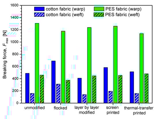 Mechanical properties of tested fabrics were determined using a tensile testing machine (Instron, model 4204 made in Norwood, MA, USA). Breaking force and elongation at break for unmodified and modified fabrics were determined according to PN-EN ISO 13934-1:2013. The size fabric samples were 250 mm × 50 mm. The tests were performed at a crosshead speed of 100 mm·min−1. The measurements of both mechanical parameters were taken in the direction of the warp and weft.