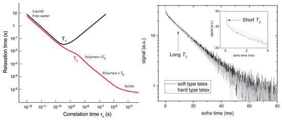 Left: Dependence of and upon (Reproduced from Chem. Soc. Rev., 2014,43, 1627–1659 with permission from the Royal Society of Chemistry.) [106]. Right: Signal decay of a latex film measured with a GARField NMR. Both soft and hard-type latex are visible and show a multi-exponential decay where the short and long – component are marked. The short relaxation time is attributed to hydrogen atoms within the polymer, while the long relaxation time comes from free water. (Reprinted from Progress in Organic Coatings, Volume 123, Benjamin Voogt, Henk Huinink, Bart Erich, Jurgen Scheerder, Paul Venema and Olaf Adan, Water mobility during drying of hard and soft type latex: Systematic GARField H NMR relaxometry studies, Pages 111–119, Copyrights 2018, with permission from Elsevier [107]).