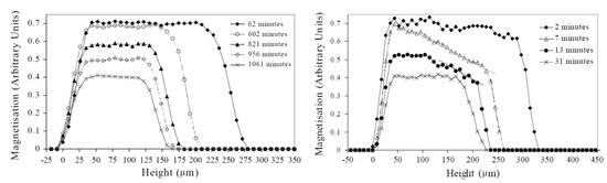 To profile thin films with a high-enough resolution, a high gradient is required, see Equation (6). Three NMR setups are able to generate high-enough gradients to profile films between 10–1000 µm, namely, STRAFI (STRAy FIeld) [114], GARField (Gradient-At-Right-angles-to-Field) [74] and MOUSE (MObile Universal Surface Explorer) [115]. In these high-gradient setups, where , Equation (6) cannot be used anymore because the curvature in the magnetic field lines is significant, see Figure 1 right.