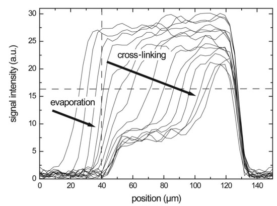 MRI has made its way into material research, as well as in polymer research [22,63,64,65,66]. NMR can be used to measure density profiles, atoms’ mobility, and probe their environment which enables to study reactions and transport processes in thin layers. Reactions in thin films, such as cross-linking [67,68,69], glass transitions, curing and many more chemical reactions, will all influence the mobility of the atoms, which is visible in the NMR signal. Additionally, transport processes can be studied by measuring time-dependent density profiles. We will discuss different studies to demonstrate how chemical and physical information of thin polymer films between 10 and 1000 µm can be extracted using high-spatial-resolution NMR setups.