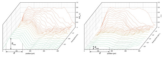 In the special case, when the frequency band with of the excitation pulse is large enough to capture the complete sample, a Fourier transform STRAFI can be implemented [118]. Here, the echo is collected from the whole sample and the profile is reconstructed by a Fourier transform. Using this method, measurements are only limited by and not because of mechanical movement. This technique was mostly used to image thin film below 400 µm. The theoretical resolutions in these measurements are determined by Equation (21). However, the resolution is mostly limited by the shape of the sensitive area and should be determined experimentally. A major drawback of STRAFI is that the sensitive area where the -field is most homogeneous does not coincide with the optimum gradient position. Therefore, the actual gradient is mostly lower than the maximum gradient that is reported for the particular electromagnet used in the STRAFI setups. After a trade-off between measurement speed and resolution, the most encountered studies reported resolutions between 50 [124]–450 [122] µm.