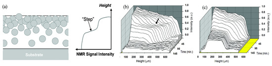 Experimental techniques able to study film formation, reaction and transport processes are necessary to gain the insights allowing improvement of performance and stability. Since many processes in thin layers such as diffusion, curing and chemical reactions will happen with a so-called front, gaining spatial and time-dependent information is a crucial requirement. Conventional techniques are not able to gain both spatial and time-resolved information coherently. Techniques such as weight measurements [56], microscopy or ASA (Automatic Scanning Absorptometer) measurements [57] can only measure global properties such as mass or liquid uptake in the case of ASA, but will not gain spatial information. High-spatial-resolution MRI has proven to be a versatile tool for studying these processes. Nuclear Magnetic Resonance (NMR) is a well-established technique that started in 1946 where for the first time NMR was used for the detection of magnetic properties of atoms by Bloch [58,59] and Purcell [60]. The method was later extended to two different areas, namely, nuclear Magnetic Resonance Imaging (MRI) and NMR spectroscopy, which led to Nobel Prizes in Medicine [61] (Paul C. Lauterbur and Sir Peter Mansfield) and Chemistry [62] (Richard R. Ernst and Kurt Wuthrich). In this review, the focus lies on the first one (MRI).
