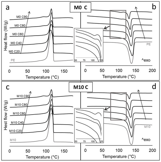 DSC thermograms showing the crystallization and melting peaks of M0 C (a,b) and M10 C (c,d) systems, respectively. Arrows indicate increasing MC content.