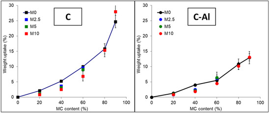 The water absorption behavior of the realized materials was reported in terms of water uptake as function of MC content during water immersion up to 1000 h (Figure 5). Curves of weight uptake vs. immersion time of each sample are reported in the Supplementary Materials Figure S6. The water absorption recorded increases with increasing MC content, as expected due to the highly hydrophilic nature of cellulose. Water absorption was lower for materials containing C-Al at all compositions, with an uptake value that is about 14% for CAl90 compared to the 25% of C90. This large difference cannot be justified only by the lower water uptake capacity of aluminum foil compared to cellulose, but is probably also related to a barrier effect offered by the aluminum fragments at the surface of tested samples (see Figure S7 in the Supplementary Materials). Absorption values of samples up to 60 wt% of C/C-Al are slightly lower in the presence of MAPE: this finding was attributed to the formation of a polymeric layer onto fiber surfaces, promoted by MAPE (as evidenced in Section 3.1), thus reducing their water binding tendency. At high MC content, the effect of MAPE is negligible due to high cellulose content. It is worth noting that, even at the highest MC content, water absorption kinetics and the equilibrium uptake values are generally lower than observed in typical fiberboards [29,30], especially for the composites containing C-Al, thus making these materials interesting candidates for the substitution of fiberboards in wet environments.